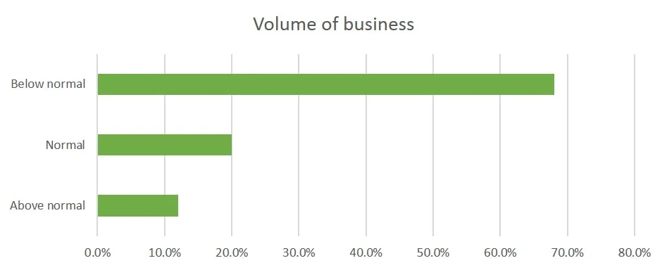 Energy services companies also indicated a marked decline in their volume of business with 68% of respondents reporting that the volume of their business was below normal.